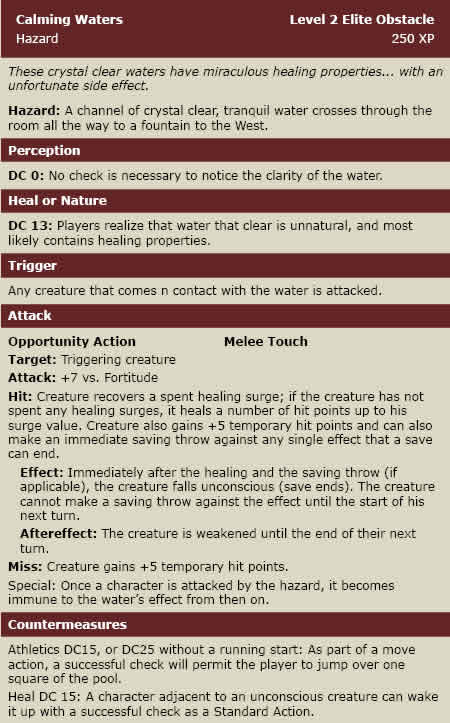 As part of my campaign, I have one room that in addition to a lot of bad guys and a few other traps there is a stream of shallow water. This water - what I refer to as a Calming Waters hazard - heals the creature that touches them quite a bit (gain a used healing surge or recover your surge value in hit points, +5 temporary hit points, make an immediate save versus an effect), but that wave of healing energy is so powerful and overwhelming that it has a nasty side effect: it knocks you unconscious for at least one full turn.